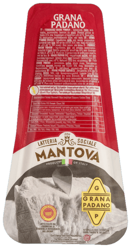 Der Grana Padano mit Herkunft aus den Regionen Parma und Reggio Emilia ist ein gepresster, körniger Hartkäse. Grana Padano hat eine sehr kleine Lochung und eine gebürstete, geölte, goldbraune Rinde. Zur Herstellung von 1kg Grana Padano benötigt man 14 Liter Milch. Das Grana Padano Kondortiumszeichen steht für geprüfte Qualität. Der Deckel und Boden der Laibe werden entfernt und nicht mitverpackt. Produktion und Reifung erfolgen garantiert nach den Vorschriften des Consorzio Grana Padano