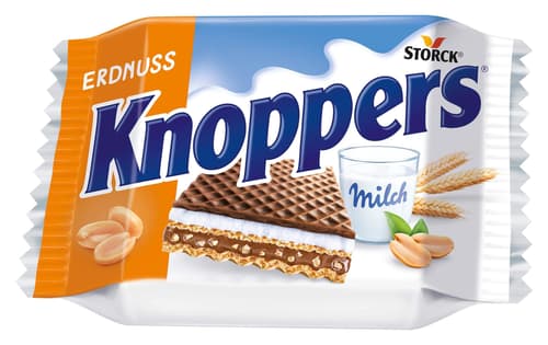 Knoppers Erdnuss je křupavá oplatka s jemnou arašídovou krémovou náplní, kousky lehce solených arašídů a lahodnou mléčnou vrstvou.