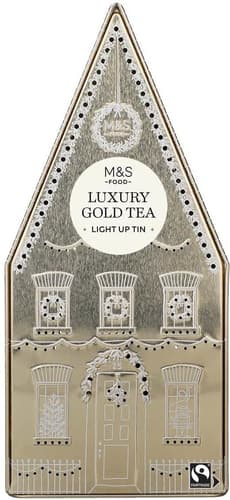 Der „Luxury Gold Tea Light Up House“ von M&S enthält 40 Teebeutel einer speziell ausgewählten Fairtrade‑Teemischung in eleganter Geschenkverpackung im Stil eines beleuchteten Haus‑Motivs.