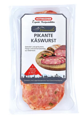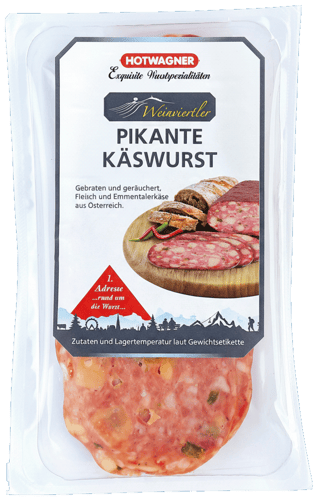 Eine herzhafte Wurstspezialität aus dem Weinviertel mit einem würzigen Kick. Unsere pikante Käsewurst von Hotwagner wird mit cremigem Käse gefüllt und mit Chili verfeinert. Das Ergebnis ist eine saftige, schnittfeste Brühwurst mit einer angenehmen Schärfe – perfekt in Scheiben geschnitten für die Jause oder zum Dippen.