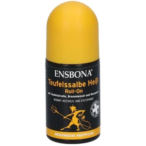 Ensbona® Teufelssalbe Heiß Roll-On ist ein intensiv wärmendes Pflegefluid mit Extrakten aus Teufelskralle, Brennnessel und Rosmarin. Es bietet wohltuende Unterstützung bei Muskel- und Gelenkschmerzen, Verspannungen und Prellungen.
