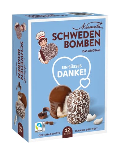 Die Niemetz Schwedenbomben 12er vereinen luftig-leichten Schaum, eine knusprige Waffelbasis und eine knackige Hülle aus Schokolade. In dieser Variante sind drei Stück mit reiner Schokolade überzogen, während die anderen drei zusätzlich mit Kokosraspeln verfeinert sind – eine klassische Kombination für abwechslungsreichen Genuss.