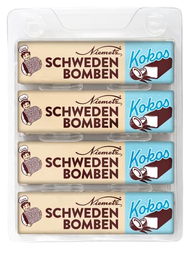 Die Niemetz Schwedenbomben Kokos Stangerl verbinden luftig‑leichten Schaum aus dem Inneren mit einer Glasur und einer feinen Kokosnote außen. In dieser Stangerl‑Form bekommst Du ein längliches Format des klassischen Schwedenbombe‑Geschmacks, das sich gut als kleiner Snack zwischendurch eignet.