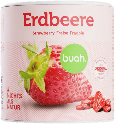- 100 % gefriergetrocknete Erdbeeren ohne Zusätze.