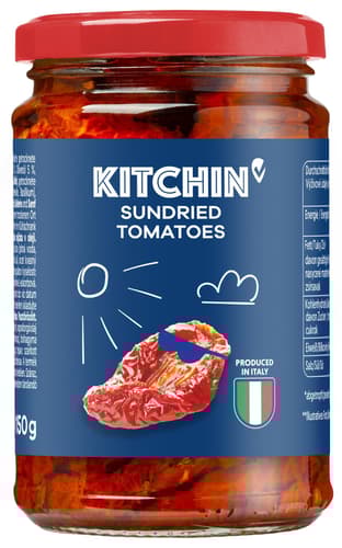 Zutaten: 48 % rehydrierte getrocknete Tomaten (Wasser, 23 % getrocknete Tomaten), 42 % Sonnenblumenöl, 5 % Olivenöl, 2 % Kapern, Salz, Weinessig (enthält Sulfite), Knoblauch (enthält Sulfite), Chilipulver, Säureregulator: E270 – Milchsäure; getrocknete Minze, getrocknete Petersilie, getrocknetes Basilikum, Antioxidationsmittel: E300 – Ascorbinsäure.