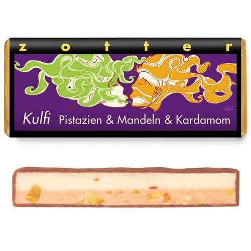 Die Zotter BIO Handgeschöpft Kulfi Pistazie‑Mandel‑Kardamon ist eine handgefertigte Schokoladentafel, die von der klassischen indischen Kulfi inspiriert ist. Dunkle Bio‑Schokolade umhüllt eine cremige Füllung aus Pistazie, Mandel und einer feinen Kardamon‑Note. Zusammen entsteht ein warm würziges und zugleich nussig‑exotisches Geschmackserlebnis, das zum bewussten Genuss einlädt.