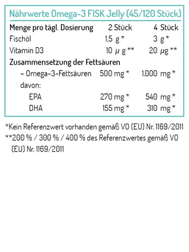 Omega-3-Fettsäuren gehören zu den essenziellen Fettsäuren und werden in jeder Lebensphase besonders für die normale Funktion des Gehirns und der Augen benötigt. Durch die Kombination mit Vitamin D wird zusätzlich die normale Funktion der Knochen, der Muskeln, der Zähne und das Immunsystem unterstützt.