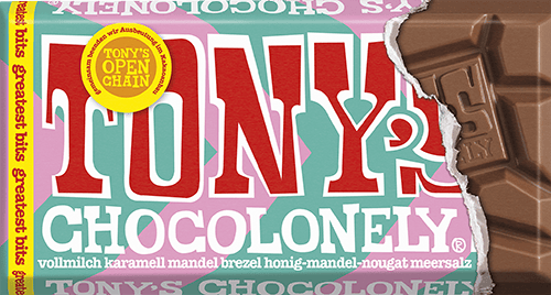 Diese Tafel ist ein Best-of der beliebtesten Tony’s Sorten: cremige Vollmilchschokolade mit Karamellstückchen, Mandeln, Brezel, Honig-Mandel-Nougat und Meersalz. Ein Mix, der zeigt, wie abwechslungsreich Schokolade sein kann – und dabei immer fair produziert wird.