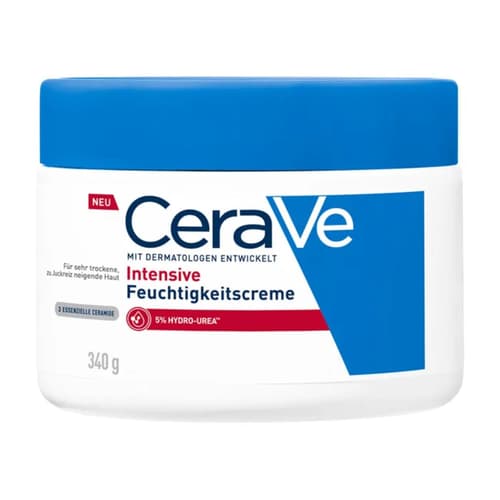Trockene Haut liegt meist eine gestörte Hautschutzbarriere zugrunde, was zu unangenehmem Juckreiz, Spannungsgefühlen und Abschuppung der Haut führen kann. Die Intensive Feuchtigkeitscreme von CeraVe enthält den hydrierenden Wirkstoffkomplex Hydro-Urea, der trockener Haut intensive Feuchtigkeit spendet – und dank patentierter MVE-Technologie bis zu 72 Stunden anhält. Hautberuhigende Sheabutter wiederum sorgt für ein weiches, geschmeidiges Hautgefühl. Zusätzlich unterstützen die drei essenziellen Ceramide 1,3 und 6-II die Regeneration der natürlichen Hautbarriere, sodass Feuchtigkeit besser eingeschlossen und Hauttrockenheit vorgebeugt wird.