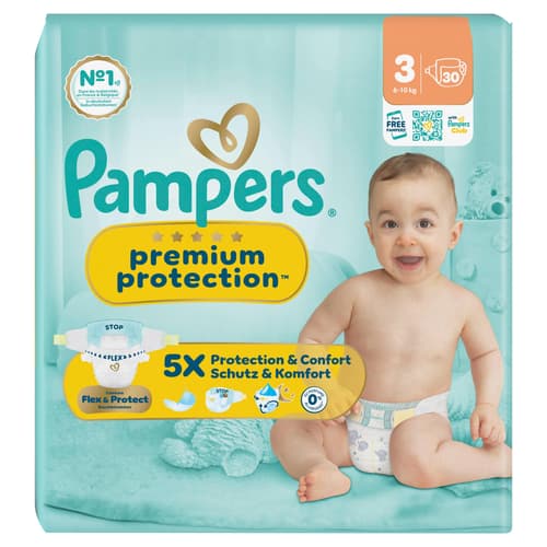Pampers Premium Protection Windeln Gr. 3 Midi (6-10kg) bieten zuverlässigen Schutz und Komfort für empfindliche Babyhaut. Die Windeln sind dermatologisch getestet und enthalten keine absichtlich hinzugefügten EU-Parfümallergene.