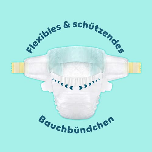 Die Windeln verfügen über saugfähige Poren, die Feuchtigkeit sofort aufnehmen, ein Stop & Schutz Täschchen gegen Auslaufen am Rücken und kuschelweiche Materialien für maximalen Komfort. Das flexible Bauchbündchen schützt die zarte Babyhaut zusätzlich.