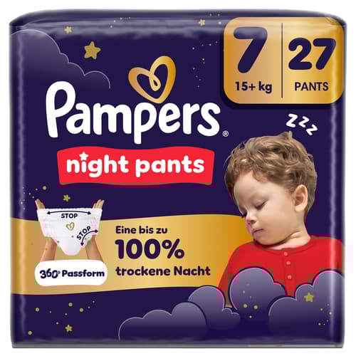 Deutschland,Pampers Night Pants Gr. 7 bieten zuverlässigen Schutz für die Nacht. Der super saugfähige Kern sorgt für bis zu 100% auslaufsichere Nächte, während das 360° Bauchbündchen sich den Bewegungen des Babys anpasst.