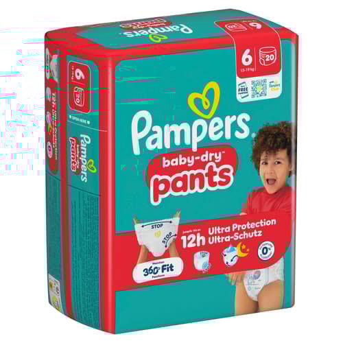 Deutschland,Pampers Baby-Dry Pants Gr. 6 Extra Large (13-19kg) bieten zuverlässigen Rundum-Auslaufschutz für aktive Babys. Mit dem Stop & Schutz System sorgen sie für bis zu 12 Stunden Trockenheit und Komfort.