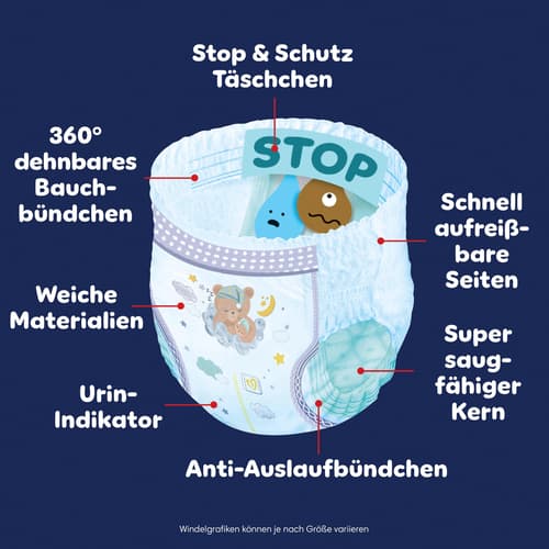 Deutschland,Pampers Night Pants Gr. 5 bieten zuverlässigen Schutz für die Nacht. Der super saugfähige Kern sorgt für bis zu 100% auslaufsichere Nächte, während das 360° Bauchbündchen sich den Bewegungen des Babys anpasst.