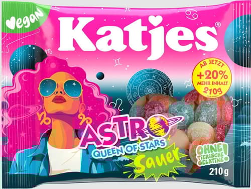Die Sterne stehen gut für alle Naschkatzen: Mit Katjes Astro Queen of Stars holst du dir den gesamten Tierkreis direkt in dein Sackerl. Der galaktische Mix aus weichem Schaumzucker und fruchtigem Fruchtgummi ist fein-säuerlich kandiert und sorgt für ein prickelndes Geschmackserlebnis, das buchstäblich nicht von dieser Welt ist. It’s magic!