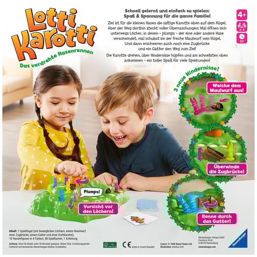 Das Brettspiel Lotti Karotti von Ravensburger ist ein unterhaltsames Familienspiel, das strategisches Denken fördert. Ziel ist es, die eigene Karotte als Erste ins Ziel zu bringen, während unerwartete Hindernisse den Weg erschweren.