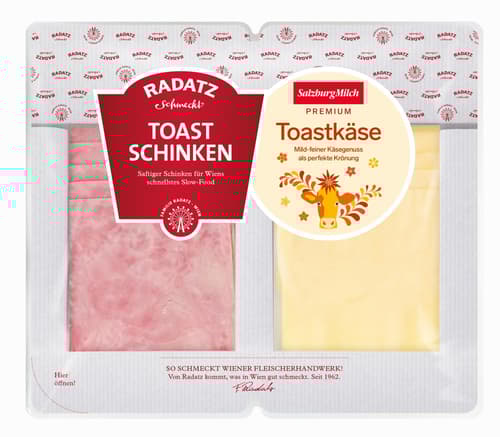 Warum sich entscheiden, wenn man beides haben kann? Das Radatz Toast-Duo ist die ideale Kombi für alle Fans der Wiener Jausenkultur. Mit fein abgestimmten Schinken- und Käsekomponenten in gewohnter Radatz-Qualität gelingt der Klassiker unter den warmen Snacks garantiert. Saftig, würzig und genau richtig für den schnellen Hunger, ohne auf den g'schmackigen Fleischer-Standard zu verzichten.