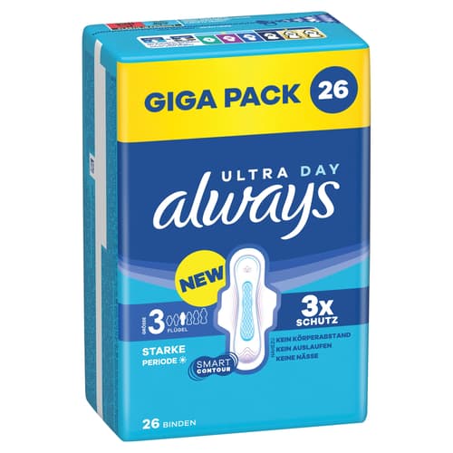 Deutschland,Always Ultra Damenbinden Größe 3 (Long Plus) mit Flügeln bieten Schutz bei starker Periode. Im Gigapack sind 26 Stück enthalten.