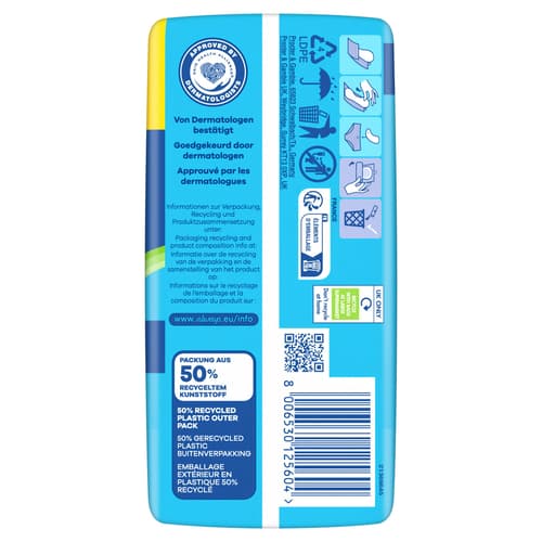 Die Smart Contour-Technologie unterstützt eine körpernahe Passform, damit Flüssigkeit gezielt aufgenommen wird. Die weiche Oberfläche absorbiert in Sekunden und sorgt für ein trockenes Gefühl. Mit OdourLock werden Gerüche neutralisiert, für Frische im Alltag.