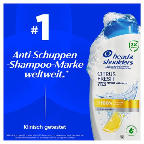 Frankreich,Head & Shoulders Citrus Fresh Anti-Schuppen-Shampoo wirkt effektiv gegen Schuppen und pflegt gleichzeitig die Kopfhaut. Die 3X Schutz * Formel mit Pirocton-Olamin wirkt tief an der Quelle gegen drei Kopfhautprobleme * bereits ab der ersten Wäsche. Klinisch bewiesen und dermatologisch getestet, bietet es bis zu 100% Schutz vor Schuppen * * und ist ideal für die tägliche Anwendung. * Wirkt gegen 3 Kopfhautprobleme: Schuppen, Juckreiz durch Schuppen und Fett * * Bei regelmäßiger Anwendung