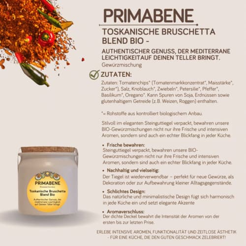 Hol dir das sonnige Lebensgefühl Italiens nach Hause! Diese fruchtig-aromatische PRIMABENE® Gewürzzubereitung aus Tomatenchips, Knoblauch, Zwiebeln, mediterranen Kräutern und feinen Gewürzen bringt den authentischen Geschmack der Toskana auf deinen Teller. Ob klassisch auf geröstetem Brot, als Verfeinerung für Pasta- und Pizzasaucen oder zum Abschmecken mediterraner Gerichte – dieser Blend ist ein Muss für alle Liebhaber der italienischen Küche.