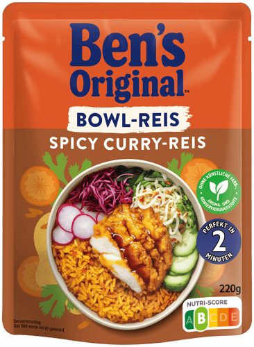 Bring ordentlich Pep in deine Kuchl! Der Ben's Original Express Spicy Curry Bowl-Reis ist die perfekte Basis für alle, die es gerne pikant und aromatisch lieben. Fein abgestimmter Langkornreis trifft auf eine goldgelbe Curry-Gewürzmischung mit einer angenehmen Schärfe, die deine Geschmacksknospen wachkitzelt. Dank der schonenden Dampfgahrung ist der Reis im Sackerl bereits perfekt vorbereitet und in nur zwei Minuten bereit für deine kreativen Bowl-Kreationen.