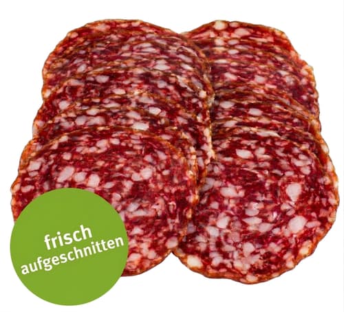 Holen Sie sich den Klassiker der italienischen Jausenkultur direkt nach Hause. Unsere Mailänder Salami wird nach traditionellem Rezept gereift und erst kurz vor der Lieferung frisch für Sie aufgeschnitten. Mit ihrer charakteristischen feinen Körnung und der milden, aber dennoch markanten Würze ist sie ein absoluter Fixstarter in jedem gut sortierten Sackerl.