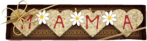 Schokoladeherzen „Mama“ sind Herzen aus edler BIO-Schokolade, vermischt mit Brownie-Crumble. Eine kleine süße Aufmerksamkeit für Alltag, Feiern oder als Mitbringsel.