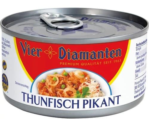 Darf’s ein bisserl mehr Pep sein? Der Vier Diamanten Thunfisch Pikant ist die ideale Wahl für alle, die ihre Jause gerne mit einer feinen Würze veredeln. Zarter, MSC-zertifizierter Thunfisch trifft hier auf eine raffiniert abgestimmte Sauce, die mit einer angenehmen Pikanterie überzeugt, ohne dabei zu scharf zu sein. Ein echtes Geschmackserlebnis, das Schwung in die Mittagspause bringt und ganz ohne langes Abschmecken direkt aus der Dose genossen werden kann.