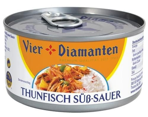 Lust auf eine schnelle Jause mit Fernweh-Garantie? Der Vier Diamanten Thunfisch in der süß-sauren Marinade bringt Abwechslung direkt aus der Dose in dein Sackerl. Zarter, MSC-zertifizierter Thunfisch trifft auf eine harmonisch abgestimmte Sauce mit feiner Paprikanote und knackigen Gemüsestückchen. Authentischer Geschmack, der ohne langes Kochen sofort Urlaubsstimmung auf den Teller zaubert – ideal, wenn es in der Mittagspause mal wieder schnell gehen muss, du aber auf Qualität nicht verzichten willst.