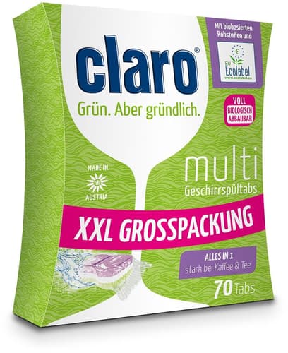 Die claro Multi Geschirrspültabs sind die Multitasker unter unseren Tabs, denn sie machen am liebsten alles gleichzeitig. Die Alles in 1 Tabs haben die Salz- und Klarspülfunktion bereits integriert, es werden also keine Zusatzprodukte mehr benötigt. Gleichzeitig sind sie auch ein Spezialist für Kaffee- und Teeflecken. Mit patentiertem ökologischem Silberschutz.