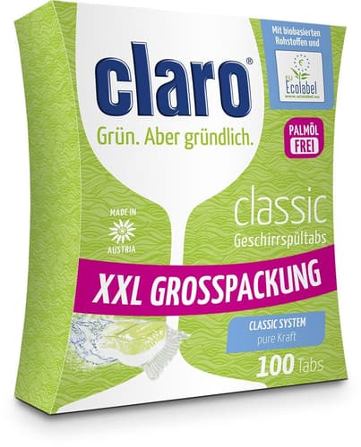 Die claro Classic Geschirrspültabs entfalten ihre ganze Kraft bei gemeinsamer Verwendung mit dem claro Alpensalz und dem claro Klarspüler. Ein Tab, in wasserlöslicher Folie, pro Spülgang reicht aus, damit dein Geschirr wieder strahlend sauber wird.