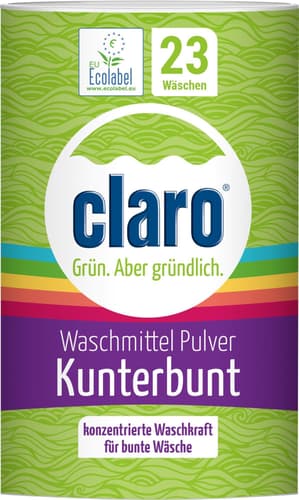 Das claro Waschmittel-Pulver Kunterbunt reinigt deine bunte Wäsche auf Basis nachwachsender Rohstoffe und verzichtet dabei komplett auf Mikroplastik und Farbstoffe.