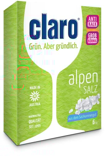 Das claro Alpensalz garantiert lupenreine Qualität in jedem Salzkorn. Das Wasser wird enthärtet und verhindert somit gefährliche Kalkablagerungen in der Spülmaschine. Das Alpensalz wird in Österreich abgebaut und abgefüllt.