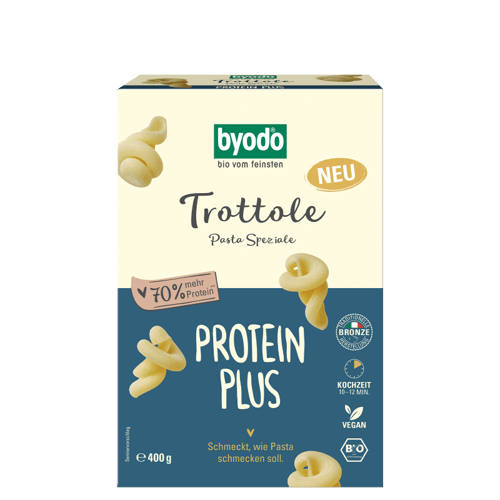 Bringen Sie Schwung in Ihre Küche mit der wohl charmantesten Pasta-Form Italiens! Die Byodo BIO Protein PLUS Trottole (italienisch für „Kreisel“) sehen nicht nur fesch aus, sondern liefern durch die clevere Rezeptur aus Hartweizen und Hülsenfrüchten auch ein ordentliches Plus an pflanzlichem Eiweiß. Diese Bio-Nudeln beweisen, dass eine bewusste Ernährung und echter Genuss wunderbar in ein Sackerl passen. Dank der raffinierten Windungen bleibt der Biss fest und die Sauce dort, wo sie hingehört.