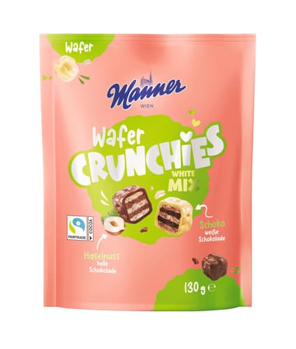 Für alle Fans von heller Verführung: Der Manner Crunchies White Mix bringt dir die perfekte Kombination aus dem unverwechselbaren Manner-Knuspererlebnis und zarter weißer Schokolade. Mundgerechte Stücke der Original Manner Waffel treffen hier auf feine Schokocrunchies und werden von einer Hülle aus sanft schmelzender weißer und Milch-Schokolade umschlossen – eine helle Freude für deinen Gaumen.