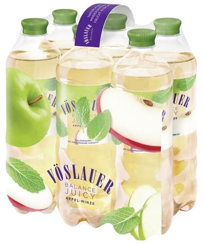 Vöslauer Balance Juicy Apfel-Minze ist die leichte Erfrischung mit vollem Geschmack. Dieses natürliche Mineralwasser aus Österreich kombiniert 7% Fruchtsaft mit ausgewählten Aromen und Extrakten. Es enthält nur 15 kcal pro 100 ml, ist zuckerarm, ohne Konservierungsstoffe und 100% vegan. Ideal für alle, die eine spritzige, kalorienarme Durstlöscher suchen. Erhältlich im praktischen 6x0,75l EinwegPFAND-Pack.