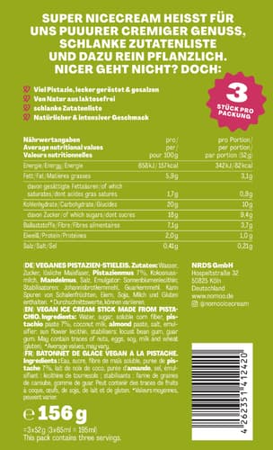 Genießen Sie das cremige NoMoo Pistazien-Eis, eine köstliche pflanzliche Alternative in praktischen 3x65ml Portionen. Dieses intensive Pistazien-Eis ist nicht nur laktose- und glutenfrei, sondern enthält auch weniger Zucker und wird aus 100% natürlichen Zutaten in Bio-Qualität hergestellt. Ohne künstliche Aromen oder Konservierungsstoffe ist dieses gefrorene Dessert aus Deutschland perfekt für eine bewusste Auszeit.