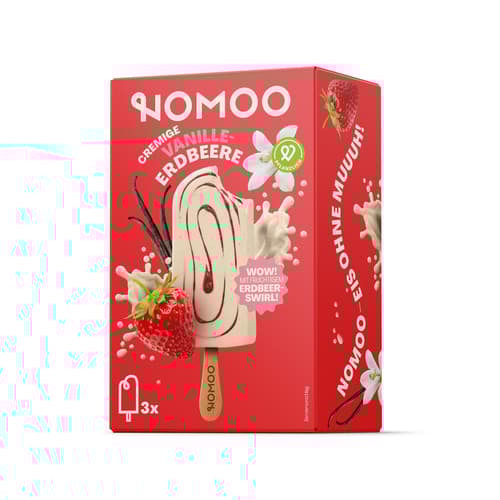 Deutschland,NOMOO Vanille-Erdbeereis kombiniert eine milde Vanillenote mit fruchtigem Erdbeer-Geschmack in praktischen Portionen. Das Eis ist pflanzlich, kuhmilchfrei sowie laktose- und glutenfrei.