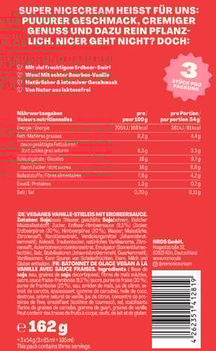 ZUTATEN: Sojabasis (Wasser, geschälte Sojabohnen), löslicher Maisballaststoff, Zucker, Erdbeer-Himbeersauce (9,3 %) (Zucker, Erdbeerpüree (30 %), Himbeerpüree (20 %), Wasser, Maisstärke, Zitronensaft, Karottenextrakt, Verdickungsmittel (Johannisbrotkernmehl)), Kokosöl, Traubenzucker, natürliches Vanillearoma, Zitronensaft, Ackerbohnenproteinkonzentrat, Emulgator (Sonnenblumenlecithin), Salz, Stabilisatoren (Johannisbrotkernmehl, Guarkernmehl), Vanillesamen.