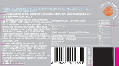 Zutaten: entalkoholisierter Wein 90% (Trauben, Konservierungsstoff: SCHWEFELDIOXID, Säurerugulator: Weinsäure), Zucker, Kohlendioxid, färbendes Lebensmittel (Karamellzuckersirup, Apfelkonzentrat), färbendes Lebensmittel (Konzentrat aus Süßkartoffel, Karotte), natürliches Aroma, Aroma Chinin