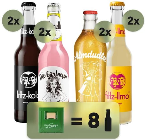 Entdecken Sie die Gurkerl.at Limonaden Kiste, Ihre ultimative Erfrischung im 8er-Pack! Dieser bunte Mix vereint Kultklassiker und aufregende neue Geschmacksrichtungen aus Österreich und darüber hinaus. Genießen Sie die einzigartige Murelli Rhabarber & Minze, das zeitlose Almdudler Original mit Alpenkräutern, die charakterstarke Fritz-kola Original mit Koffein und Vanille sowie die spritzige Fritz-limo Zitrone für den puren Frischekick. Eine tolle 2.68L Mehrweg-Kollektion für jeden Geschmack.