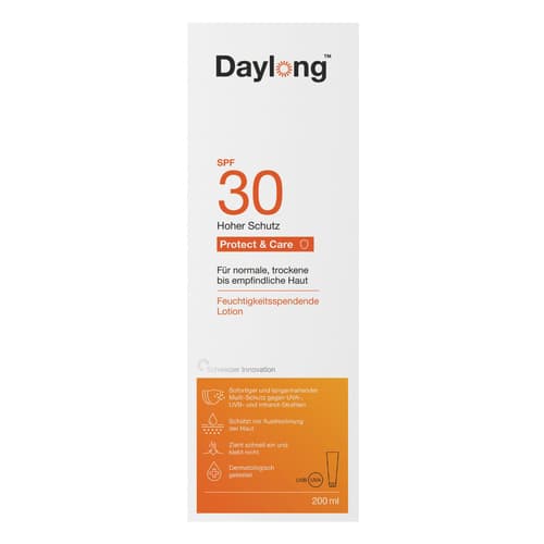 Komfortabel in jeder Hinsicht: Die Daylong liposomale Lotion SPF 30 zieht schnell in die Haut ein und bietet sofortigen Schutz. Gleichzeitig spendet die nicht fettende Lotion Ihrer Haut 4 Stunden lang Feuchtigkeit, so dass eine zusätzliche Feuchtigkeitspflege nicht notwendig ist. Dank der liposomalen Zusammensetzung (hautähnlicher Aufbau der Moleküle) verteilen sich die photostabilen UVA-, UVB- und IR-Filter ganz gleichmässig in der Haut und schützen damit vor den schädlichen Strahlen und beugen Hautalterung vor.