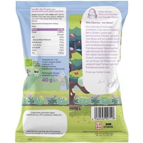 Holland,Die Pumpkin Organics Bluey Bio Mehrkorn Churros Apfel und Zimt sind ein Knabbersnack für Kinder ab 3 Jahren. Gepufft statt frittiert, ohne Zuckerzusatz (enthält von Natur aus Zucker) und ohne Aromen.