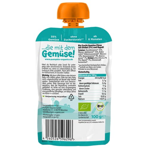 Italien,Der Pumpkin Organics Bio Gemüse-Quetschie kombiniert Karotte mit Apfel und Kokosmilch sowie Banane, Ananas und Dinkel. Die Rezeptur setzt auf Gemüse als Basis und bringt eine fruchtig-tropische Note in den Quetschbeutel.