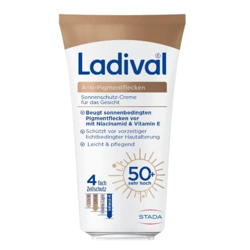 Ladival® Anti-Pigmentflecken Sonnen-Creme mit LSF 50+ schützt deine Haut effektiv vor sonnenbedingten Zellschäden wie Pigmentflecken und sonnenbedingter Hautalterung. Die nicht-komedogene Rezeptur (verstopft keine Poren) ist bei empfindlicher Haut, Mischhaut sowie zu Akne neigender Haut geeignet. Als Antioxidans stärkt Vitamin E die Hautbarriere, vermindert Hautschäden und schützt vor freien Radikalen. Der Inhaltsstoff Niacinamid hat ebenfalls antioxidative Eigenschaften und regt die Lipid-Produktion sowie die körpereigene Kollagenbildung an. Dank ihrer leichten und pflegenden Rezeptur zieht der Sonnenschutz Anti-Pigmentflecken schnell ein und bietet die ideale Grundlage für dein Make-up: