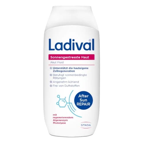 Das Ladival® Après Pflege Akut beruhigende Fluid ist ein Apothekenprodukt mit ultra-leichter Formel, das sonnengestresste Haut sofort kühlt und intensiv pflegt. Angereichert mit dem Algenenzym Photolyase, Panthenol und Vitamin E, beruhigt es Rötungen und Spannungsgefühle. Es unterstützt die Zellregeneration und hinterlässt ein angenehmes Hautgefühl. Ideal für sonnenverwöhnte Haut, kommt in einer praktischen 200 ml Flasche.