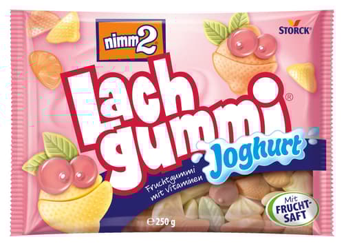 nimm2 Lachgummi Frucht & Joghurt überzeugt mit der köstlichen Symbiose. Die Leckereien bestehen aus weichem Fruchtgummi mit dem Geschmack von Banane, Orange, Zitrone, Kirsche, Erdbeere und Waldmeister und sind in der Form von witzigen Fruchtstückchen gestaltet, die zu lustigen Gesichtern zusammengesetzt werden können. Eine softe Schicht mit mildem Magermilch-Joghurt verfeinert die Spezialität und macht sie zusammen mit Fruchtsaft zu einem leckeren Genuss für jeden Naschliebhaber.