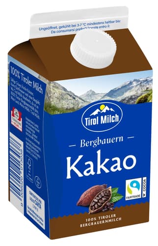 Tiroler Kakaomilch aus Bergbauernmilch mit 3,6 % Fett, pasteurisiert. Dieses Produkt ist zum direkten Verzehr geeignet.