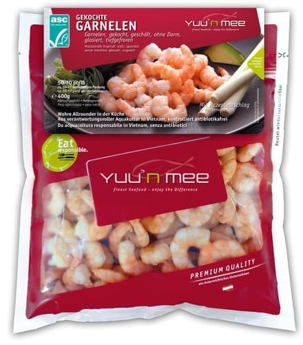 Der österreichische Seafood-Experte Yuu'n Mee steht für nachhaltigen Seafood-Genuss in herausragender Produktqualität. Yuu'n Mee Gekochte Garnelen in der Größe 50-70 pc/lb stammen aus einer nachhaltigen und umweltschonenden Aufzucht in Vietnam, sind 100% kontolliert frei von Antibiotika und Zusatzstoffen. Daher schmecken Yuu'n Mee Gekochte Garnelen so unwiderstehlich natürlich, klar und frisch mit einer fein süßlichen Note und gut spürbarem Biss. Yuu'n Mee Gekochte Garnelen 50-70 sind bereits gekocht und geschält und nach dem Auftauen essfertig. Sie schmecken herrlich auf bunten Salaten, Bowls oder in feinen Garnelen-Cocktails. Aber auch für warme Gerichte sind sie bestens geeinget - idealerweise nur kurz erwärmen. Der österreichische Seafood-Experte Yuu'n Mee steht für nachhaltigen Seafood-Genuss in herausragender Produktqualität. Yuu'n Mee Gekochte Garnelen in der Größe 50-70 pc/lb stammen aus einer nachhaltigen und umweltschonenden Aufzucht in Vietnam, sind 100% kontolliert frei von Antibiotika und Zusatzstoffen. Daher schmecken Yuu'n Mee Gekochte Garnelen so unwiderstehlich natürlich, klar und frisch mit einer fein süßlichen Note und gut spürbarem Biss. Yuu'n Mee Gekochte Garnelen 50-70 sind bereits gekocht und geschält und nach dem Auftauen essfertig. Sie schmecken herrlich auf bunten Salaten, Bowls oder in feinen Garnelen-Cocktails. Aber auch für warme Gerichte sind sie bestens geeinget - idealerweise nur kurz erwärmen.